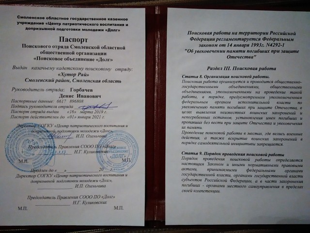 16 марта 2019 г. в архиерейском подворье Катыни г. Смоленска состоялся традиционный весенний сбор по организации работы «Вахты Памяти-2019». В ходе мероприятия, общим собранием представителей поискового движения единогласно проголосовали за принятие в свои ряды казачьего поискового отряда « хутор Рай». Как свидетельство о регистрации, был получен паспорт поискового отряда Смоленской областной организации « Поисковое объединение « Долг». Руководителем нового отряда стал атаман « СХКО «хутор Рай» подъесаул Д.И. Горбачёв.