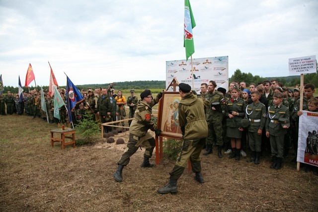 Присутствие делегатов казачьего поискового отряда хутора Рай на торжествах почитания иконы Божья Матерь Взыскания погибших в День смоленского поисковика, на открытие памятника Герою Советского Союза Марии Октябрьской.